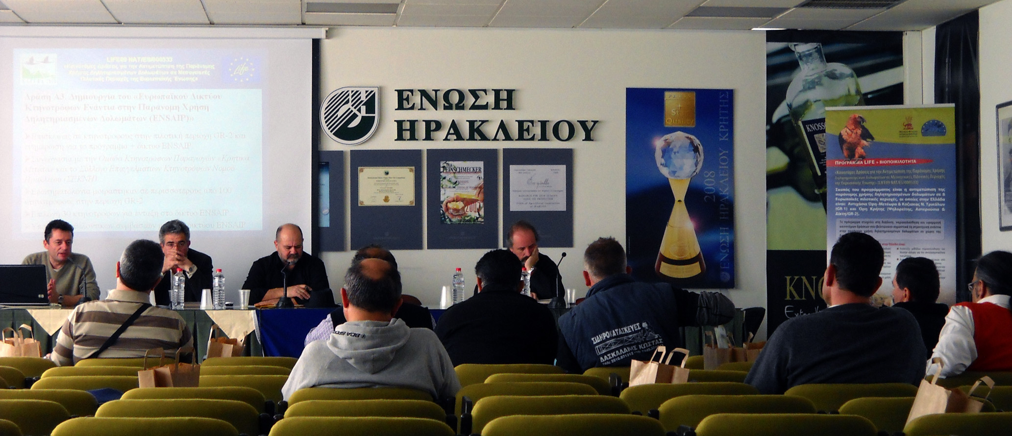 The workshop was organized in the framework of the LIFE+ Nature & Biodiversity project on “Innovative Actions against Illegal Poisoning in EU Mediterranean Pilot Areas” [LIFE09 NAT/ES/000533] in the pilot area of Crete (mountainous areas of Idi, Asterousia and Dikti). The Association of Professional Stockbreeders of Heraklion Prefecture (SEKNH) and the Group of Producers Stockbreeders of Crete «KRITIKA MITATA» are already participating in the project as members of the “European Network of Stockbreeders against Illegal Poisoning” (ENSAIP).The main objective of the workshop was to highlight the problem of illegal use of poisoned baits, their impact on biodiversity and its connection to the conservation and development of the primary sector of Crete and especially to livestock breeding. Moreover, the major problems concerning the stockbreeders were discussed.